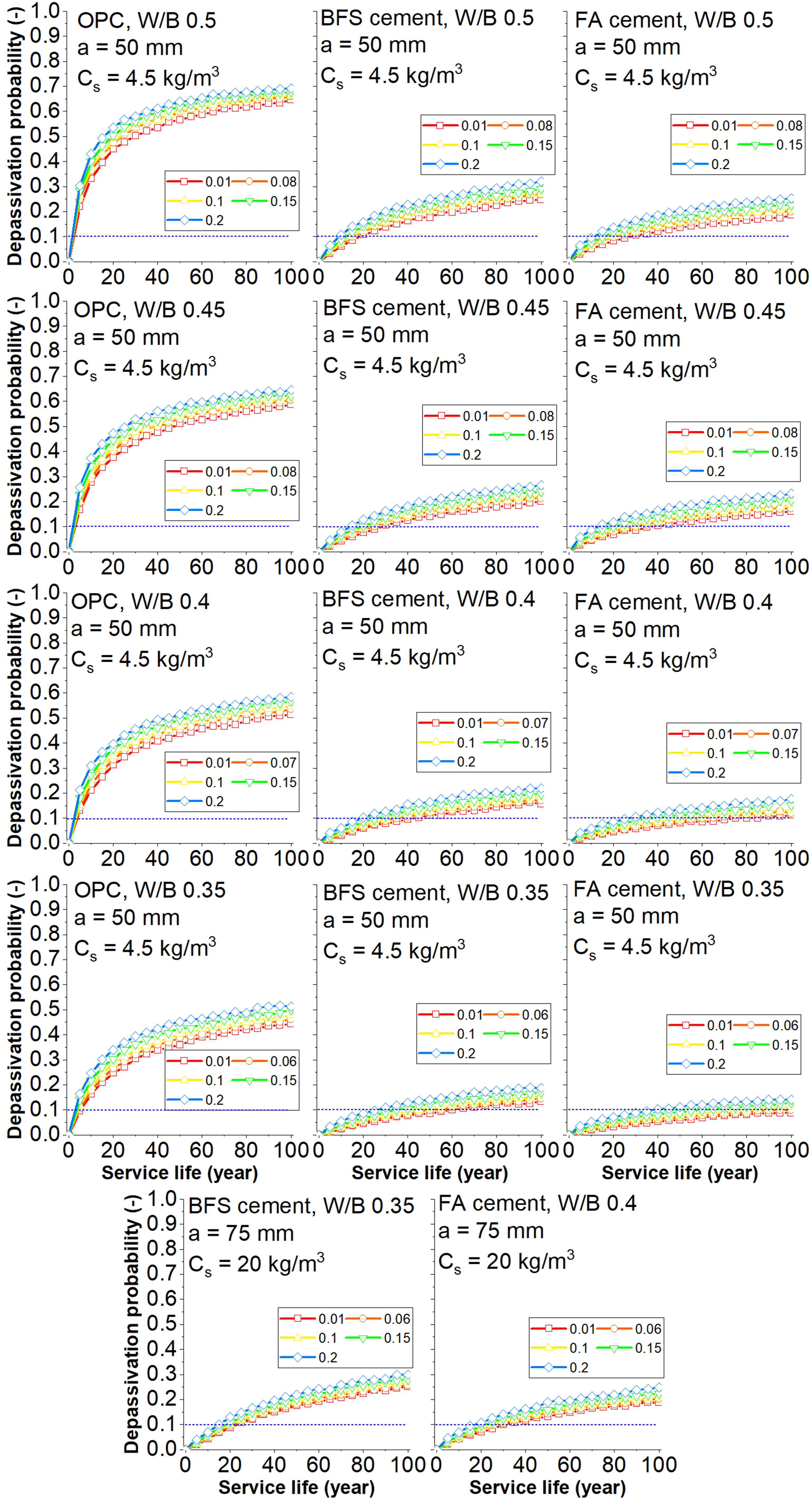 혼합시멘트를 사용한다. 이 계산 결과에서 최종적인 사용연한 조건(100년)에서 부식가능성이 0.2~0.3에 달하며, 예상 사용연한은 초기염화물량 변동에