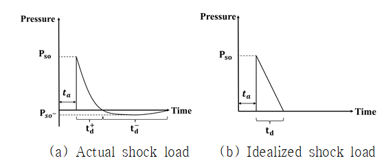 본 연구에 사용된 폭발하중은 충격파 형태로 적용하였다. ASCE (2010)는 폭발 시 발생하는 충격파를 Fig. 1(a)로 제시하고, 이를 이상화한 곡선을 Fig. 1(b)로 정의하였다. 음압($P_{so-}$)은 양압($P_{so}$)에 비해 상대적으로 압력이 낮기에 양압만을 고려하여 폭발파를 삼각형 형태로 이상화한다.