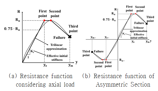 고려하였다. OpenSees의 hysteretic material model을 활용하여 비대칭 단면의 저항함수 이력 곡선을 모사하고, 철근콘크리트
