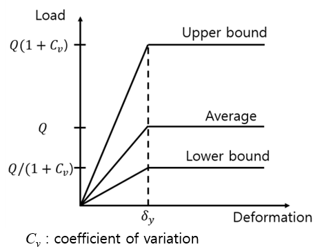 내진성능평가 세부지침(MOLIT 2024)에 따르면 유한한 강성을 갖는 경계조건으로 모델링하는 경우 기초의 모델을 Fig. 1과 같이 제시하고 있고, 강성과 강도의 불확실성을 고려하여 Fig. 2와 같이 상한치와 하한치에 대한 검토를 모두 수행하여야 한다. 상한치와 하한치 산정을 위해 변동 계수 $C_{v}$를 적용하며, 별도의 입증자료에