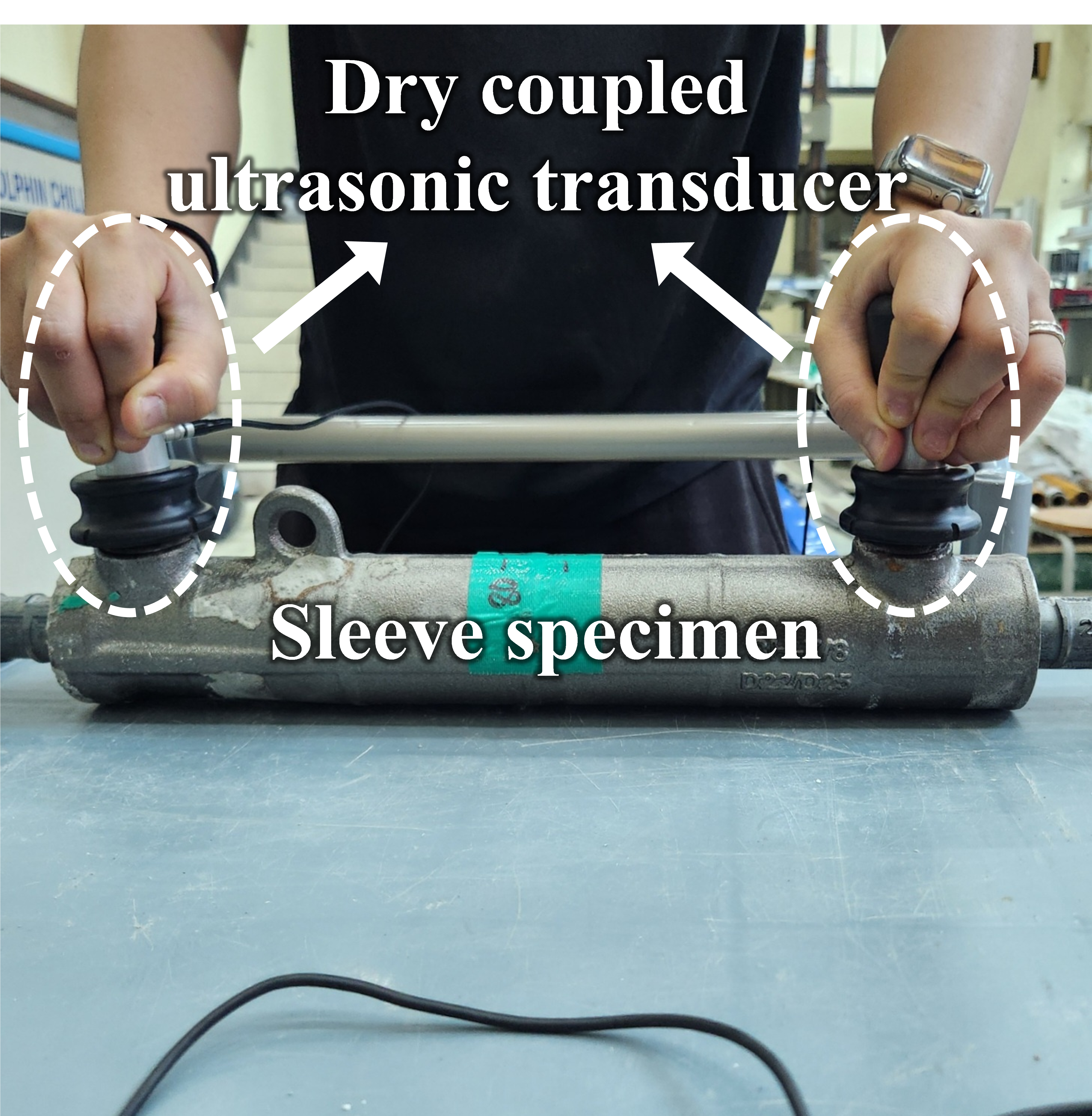 초음파 센서는 건식 접합 방식을 적용하여 별도의 커플런트(couplant) 없이 슬리브의 유입구 및 토출구 표면에 직접 접촉하여 사용할 수 있는 건식
