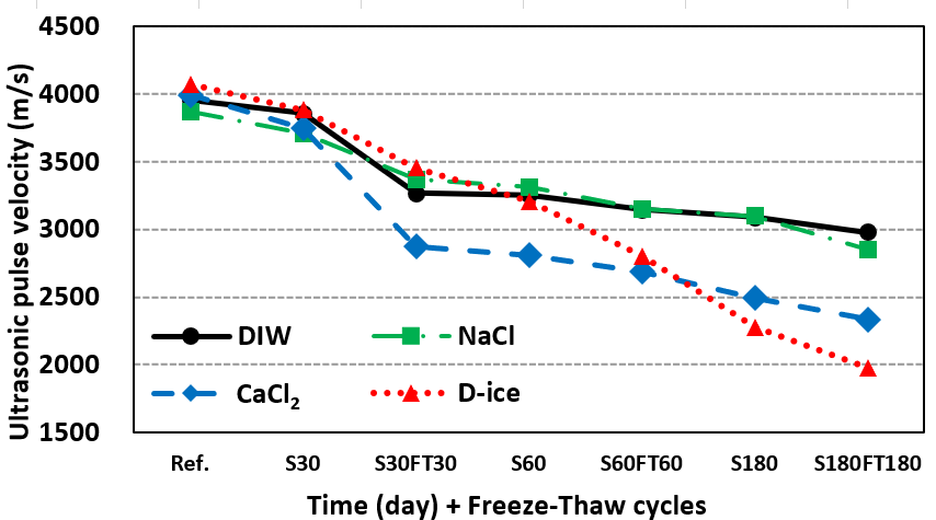미세균열이 누적되어 물리적 성질의 저하가 발생했다. 특히 CaCl2 또는 제설 염수(D-ice) 노출은 Ca2+의 높은 반응성으로 결정생성으로 인한 팽창이 크게 일어나 NaCl보다 압축강도, 초음파 속도, 동탄성계수의 저하가 큰 것으로 나타났다.