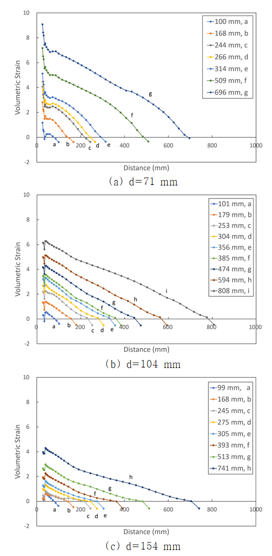 ์ฒซ์งธ, ์๋ ฅํ๊ฐ ์ ํํด ๊ฐ ๋ ์ฒด์ ๋ณํ๋ฅ (volumetric strain)์ ๋ถํฌ๊ฐ ์ด๋ป๊ฒ ๋ณํํ๋์ง๋ฅผ ๋ถ์ํด ๋ด์ผ๋ก์จ ์ค๋ฆฐ๋ ์ง๊ฒฝ๋ณ ๋ฐ์๋ฌผ์ง์ ํฝ์ฐฝ