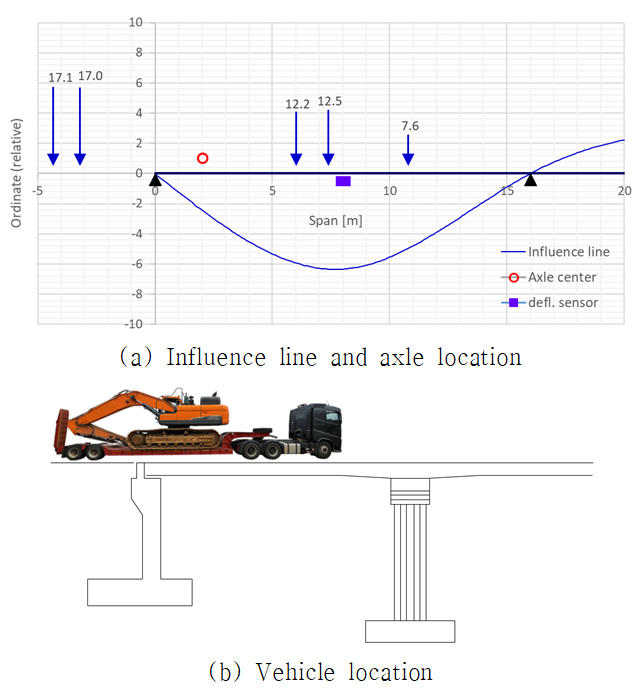 Fig. 3에는 주행시험 수행 중 교량하부에서 촬영한 사진을 수록하였다. Fig. 3(a)에서 변위계, 변형률계, 가속도계 등이 설치된 위치를 확인할 수 있으며, Fig. 3(b)에서는 5축 저상 트레일러(Low-bed trailer, 이하 LBT) 주행 시 획득한 CCTV 영상 및 변위계 신호를 확인할 수 있다.