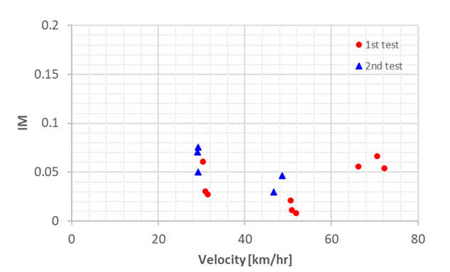 전, 후반 축의 중량 배분이 충격계수에 미치는 영향을 확인하기 위해 Fig. 20에 충격계수 분포를 도시하였다. 그림에 나타난 바와 같이, 충격계수가 0.2를 초과하는 경우는 모두 후반 2개 축의 중량이 전반 3개 축의 중량보다