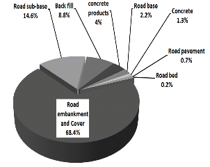 이러한 상황에서 건설폐기물의 50% 이상을 차지하는 폐콘크리트의 재활용은 증가하는 골재의 사용량을 충족하고 폐기물 매립 문제를 해결할 수 있는 대안으로 부상하고 있다. 폐콘크리트는 일련의 공정을 통해 기존 골재에 붙어있는 대부분의 시멘트 페이스트, 모르타르, 불순물 등을 제거함으로써 순환골재로 재사용 될 수 있다. 하지만, 순환골재는 천연골재에 비해 낮은 밀도와 높은 흡수율 등의 단점으로 인해 매우 제한적으로 사용되고 있다. 순환골재는 Fig. 1에 나타난 바와 같이 주로 성토 및 복토와 도로의 보조기층용으로 사용되고 있으며, 콘크리트 구조물용으로는 거의 사용되고 있지 않고 있는 실정이다.