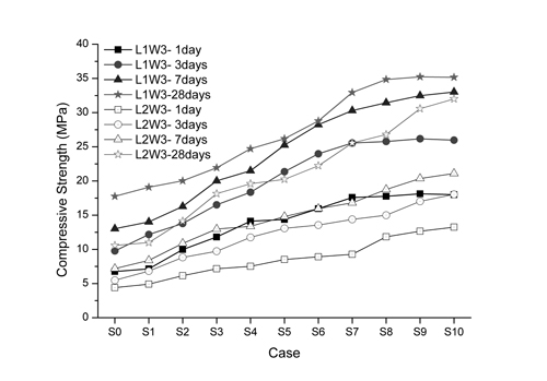 50%)์ผ ๋ S0์ 2๋ฐฐ(์๋๊ฐ๋ 100%์ด์)์ ์ด๋ฅด๋ ๋ค. L2(slag 2)์ ๊ฒฝ์ฐ W1(W/B=0.50)์ S4(SF ์นํ์จ 20%), W2(W/B=0.55)๋
