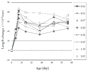 시험체의 길이는 일반적인 콘크리트의 건조수축 패턴과는 달리 재령 7일까지 다소 증가하였으며 그 이후에는 약간 감소하거나 유지하는 패턴을 나타냈다.