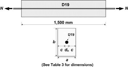 이 연구의 직접인장실험체는 Fig. 1에 보인 바와 같이 길이가 1500mm이며, 항복강도 가 420MPa인 D19 철근을 단면의 중심에 배치하였다. 실험체의 단면은 철근비 1.24%, 단면적 23250mm2으로 일정하게 유지하면서 단변 방향의 피복두께만을 변화시키기 위해 변장비가 다른 직사각형 형태로 하였다. 즉, 측면 피복두께 가 철근 직경 의 1.0배에서 3.5배까지 0.5배씩 증가되는 단면을 갖는 실험체를 비정질 강섬유와 일반 강섬유로 보강한 콘크리트를 사용하여 각각 6개씩 총 12개를