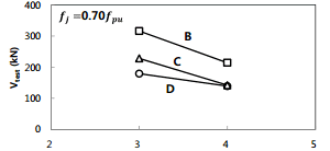 반면, 최소전단철근을 사용한 실험체 4-C와 4-D는 수평전단균열 없이 사인장 균열파괴가 발생하였다. 실험강도와 예측강도의 비()는 각각 1.25와 1.20로 실험 값이 현행 기준(식 (7))보다 20%이상 크게 나타났다.