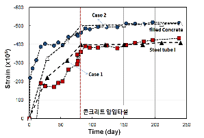 2)서강대 인공광합성센터 현장을 대상으로 CFT기둥의 장기거동을 계측한 결과, ACI 재료모델을 바탕으로 예측한 경향과 유사하게 나왔다. 또한, ACI에서