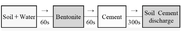 경질 모래층에서 선행굴착 병행방법으로 시공할 경우의 배합조건은 시멘트 280 kg/m3, 벤토나이트 10 kg/m3으로 하며, 점성토 지반의 경우에는 시멘트 300 kg/m3, 벤토나이트 5 kg/m3으로 한다. 본 연구에서 적용할 현장의 지반조건은 실트질 모래층으로 조사되었기 때문에, Table 1에 제시된 배합조건에서 시멘트 및 벤토나이트의