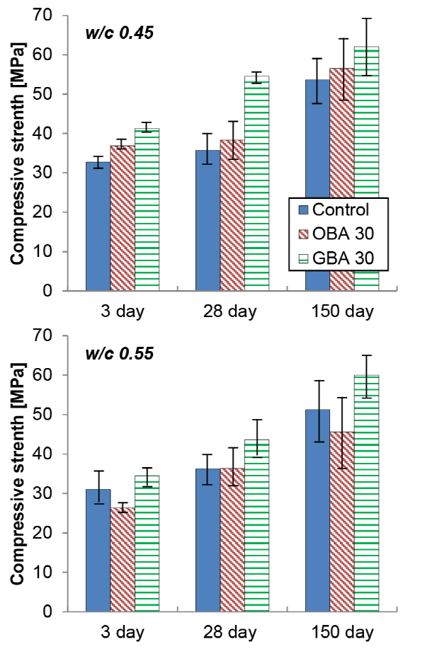 바텀애시는 모르타르의 강도에 다음의 영향을 미치게 된다. 첫 번째는, GBA의 미립분에 의한 충전효과이다. Table 1에 나타난 것 같이, GBA30은