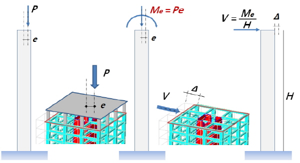 Fig. 2은 중력하중에 의해 횡변위가 발생하는 원인을 도식화하였으며, 비정형 고층건물의 횡변위 발생원인도 단순화하면 Fig. 2와 같은 원리로 접근할