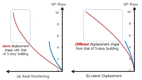 Fig. 4(a)와 같이 5층 건물의 압축측 축변위와 10층건물의 상부 5개층 압축측 축변위량은 정확히 일치한다. 즉, 10층 건물의 하부 5개층