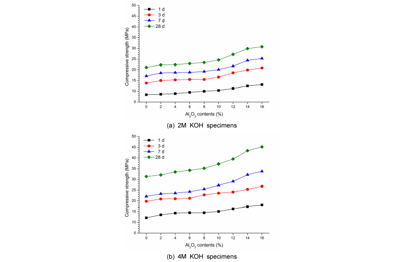 A.R. Sakulich13) ๋ฑ์ Al2O3์ ํจ์ ๋์ด ์๋ก ๋ค๋ฅธ GGBFS์ ํ์ฑํ์ ๋ก NaOH/waterglass๋ฅผ ์ฌ์ฉํ AASC์ฐ๊ตฌ์์ ์๋์ Al2O3๋ ๊ฐ๋ํฅ์์ ๊ธ์ ์ ์ด์ง๋ง ๋ค๋์ Al2O3๋ฅผ ํจ์ ํ ๊ฒฝ์ฐ๋ ๊ฐ๋ํฅ์์ ์์ธกํ ์ ์๋ค๊ณ ํ์๋ค. R. Tanzer14) ๋ฑ์ Al2O3์ ํจ์ ๋์ด ์๋ก ๋ค๋ฅธ GGBFS๋ฅผ NaOH์ potassium silicate solutions์ผ๋ก ๊ฐ๊ฐ ํ์ฑํํ ์คํ์์ Al2O3์ ํจ๋์ด ์ฆ๊ฐํ ์๋ก NaOH์ ์ํด ํ์ฑํ๋ ์ฌ๋๊ทธ์ ๊ฐ๋๊ฐ ๋ ํฅ์๋์๋ค๊ณ ํ์๋ค. M.B. Haha15) ๋ฑ์ ์๋ก ๋ค๋ฅธ Al2O3์ ํจ๋์ ๊ฐ์ง๋ GGBFS๋ฅผ NaOH์ sodium silicate solution (waterglass; WG)์ผ๋ก ํ์ฑํ์ํจ AASC์ ๋ํ
