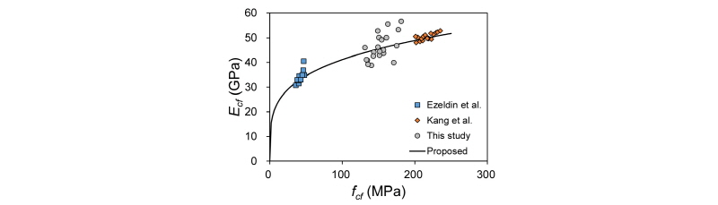 ํ ๋๋ก ์์ถ๊ฐ๋๊ฐ 200MPa ์ด์์ธ UHPCC์ ์ ์ฉ๊ฐ๋ฅํ ์์ถ๊ฐ๋์ ์ฌ์ ๋ณด๊ฐ์ง์์์ ๊ด๊ณ์์ ๋์ถํ์๋ค. ์ดํ Kang et al.2)์ UHPCC์ ์์ถ์๋ ฅ-๋ณํ๋ฅ ๊ด๊ณ๋ฅผ ์ ์ํ์์ผ๋ฉฐ, ๊ฐ์ฌ์ ๋ณด๊ฐํจ๊ณผ๋ ์์ถ๊ฐ๋์ ๊ทธ ๋์ ๊ทนํ๋ณํ๋ฅ ๋ฐ ํ์ฑ๊ณ์์ ์ํฅ์ ๋ฏธ์น๋ค๊ณ ํ์๋ค. ๋น๋ก ๊ตญ๋ด