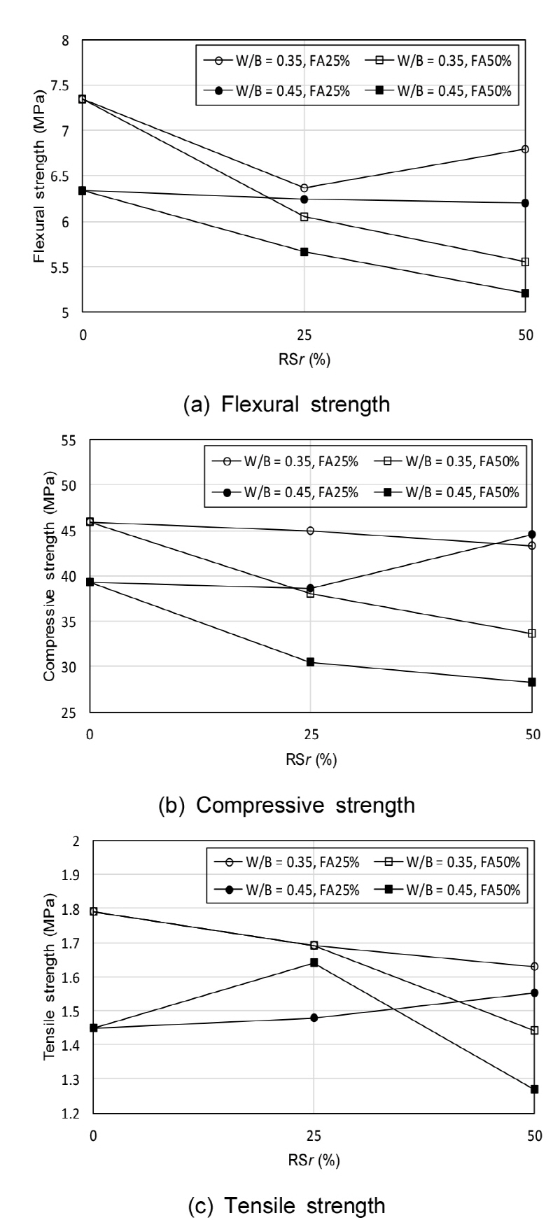 Fig. 10은 순환잔골재 및 플라이애시 치환율에 따른 휨,압축 및 인장강도 특성을 나타낸 것이며, 범례의 4가지 변수를 이용하여 각각의 물-결합재비