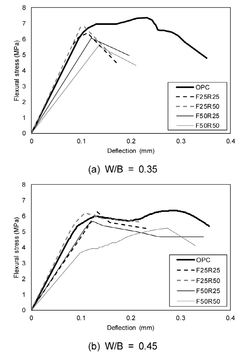 Fig. 4는 시험체의 휨 응력-처짐 관계를 나타낸 것이며, 물-결합재비 0.35를 적용한 OPC, F25R25, F25R50, F50R25 및 F50R50