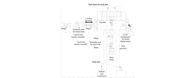 500 kn 용량의 유압잭 2개를 사용하였으며, 실험체 상부에 얹어진 강재 프레임을 통해 도입되었다. 작용 축력비()는 모든 실험체에서 0.1로 하였는데, 여기서, 는 작용 축력(kN), 는 전단벽 웨브의 단면적(mm2), 는 콘크리트 압축강도(MPa), 는 보강단면의 단면적(mm2), 및 는 피복 모르타르의 압축강도(MPa)이다. 횡방향 가력은 2,000 kn 용량의 유압잭을 이용하였으며, 상부 스터브를 관통하는 2개의 구멍을 통해
