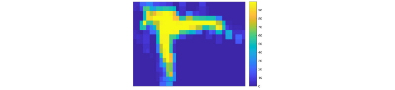 두 번의 윈도우에 의해 스캔된 이미지는 각 픽셀 당 2개의 softmax 확률값을 출력값으로 갖게 된다. 이 2개의 출력값의 평균을 계산하면 각 클래스에 대한 확률지도를 계산할 수 있다. Fig. 7은 위 Fig. 6의 이미지에 대한 박락 확률지도를 그린 것으로, 0 %부터 최대 100 %까지의 박락에 대한 확률분포를 파악할 수 있다.