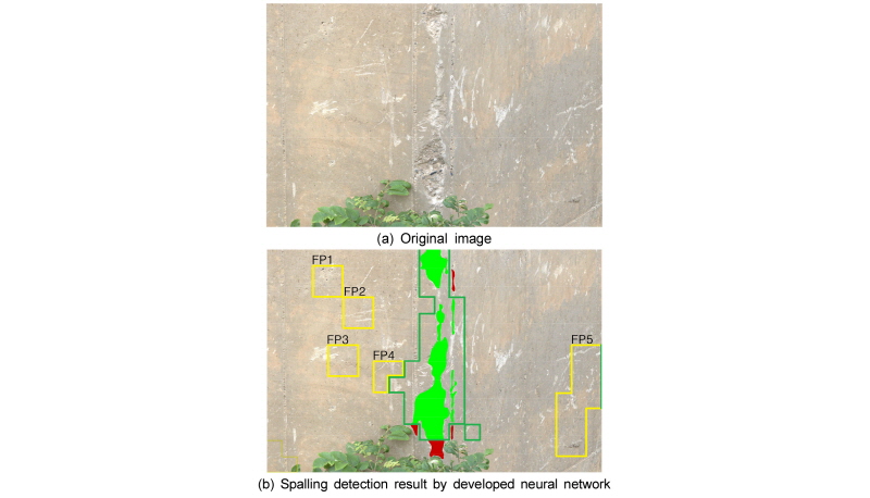 다음으로는 Fig. 5의 철근 무노출 박락 이미지를 이용하여 딥러닝 기반 박락 탐지 성능을 평가하였다. Fig. 9(a)는 Fig. 5의 2번째 이미지이며, Fig. 9(b)는 Fig. 9(a)에 대한 박락 탐지 결과이다. 각 색깔은 4.1장에서 설명한 것과 같으며, 추가적으로 붉은 색으로 색칠된 부분은 탐지하지 못한 박락부가 위치한 픽셀이다. 제안 기법이 철근 무노출 박락의 경우에도 여전히 박락의 위치를 탐지하는 데는 성공적이지만, 철근 노출 박락 대비 실제 박락이 아닌데 박락으로 탐지하는 부분(False Positive, FP)이 더 많이 나타났다. Fig. 9(b)의 5개 FP(FP1-FP5)부를 자세히 살펴보면, 모두 콘크리트 표면 위에 스크래치나 작은 홈들이 있음을 알 수 있다. 이는 본 연구에서 개발한 박락 탐지용 인공신경망을 학습시킬 때, 이와 같은 스크래치를 함께 학습시키지 못하였기 때문에 정밀도가 낮아진 것으로 예상된다. 따라서 추가적으로 콘크리트 표면에 손상이 아닌 오염, 스크래치 등의 이미지를 더 확보하여 함께 학습시킨다면, 보다 높은 정밀도의 탐지 결과를 얻을 수 있을 것으로 예상된다.