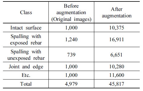 박락 탐지용 인공신경망의 성능을 높이는데 가장 중요한 요소는 학습 데이터의 양이다. 그래서 학습 이미지 수를 증가시키기 위해 5가지로 분류한 학습 이미지에 모두 이미지 분할(image segmentation)과 이미지 변형(image transformation) 기술을 적용했다. Table 2는 이미지 증강 기술을 사용하기 전에 웹스크레이핑에 의하여 획득한 이미지의 수와 이미지 증강에 의하여 증가된 학습 이미지 수를 나타낸 것이다. 이미지 증강에 의하여 전체 이미지의 수는 약 9배 정도 증가하였음을 알 수 있다. 3.3.1과 3.3.2에서는 대표적으로 이 2가지 기술을 박락에 적용시킨 사례에 대해 설명할 것이다.