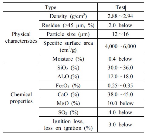 본 실험에서 사용한 고로슬래그 미분말의 물리․화학적 특성은 Table 6과 같다.