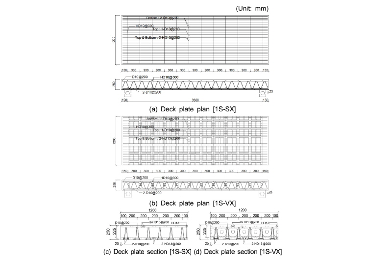 실험체는 공장 제작된 철선트러스 데크를 250 mm(높이)×1,200 mm(폭)×3,600 mm(길이)로 조립하여 Fig. 6과 같이 중공형성체를
