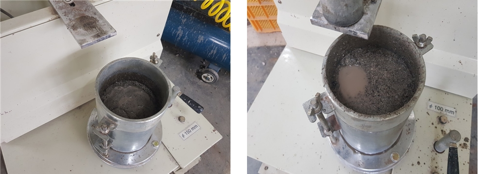 수분의 함침이 되지 않고 상부에 물이 노출되는 현상이 발생하였다. 일반적으로 다짐을 통한 최적 함수비를 도출하지만, 이러한 과정에서 물이 양이 과다할