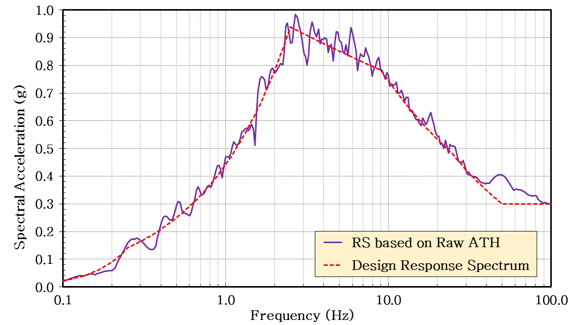 RG 1.60(USNRC 2014)์ ํ์ค์๋ต์คํํธ๋ผ์ ๊ธฐ๋ฐ์ผ๋ก ๊ณ ์ง๋์ ์์ญ์ธ 9~50 Hz๋ฅผ ์ํฅ ์กฐ์ ํ์ฌ ์์ฑํ์์ผ๋ฉฐ, ์ด๋ ๊ตญ๋ด ์ง์ง ํน์ฑ์