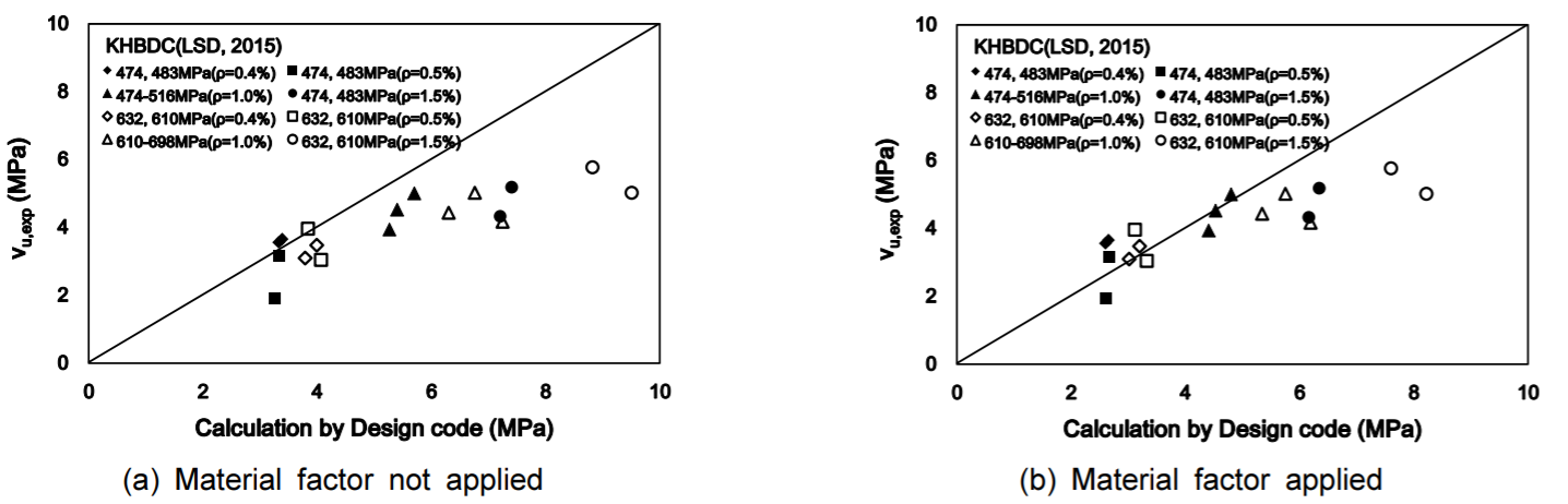 한편, 사전균열이 있는 실험체와 균열이 없는 실험체, 분리타설된 실험체의 실험강도는 전단마찰 철근의 항복강도로 실제 항복강도가 아닌 설계기준 항복강도