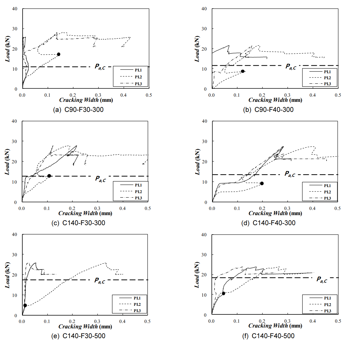 계측기의 균열폭이 증가하고, 다른 계측기의 균열폭이 감소 또는 증가가 둔화하는 점을 균열 발생 하중으로 정의하였다. 예상된 균열하중보다 상대적으로