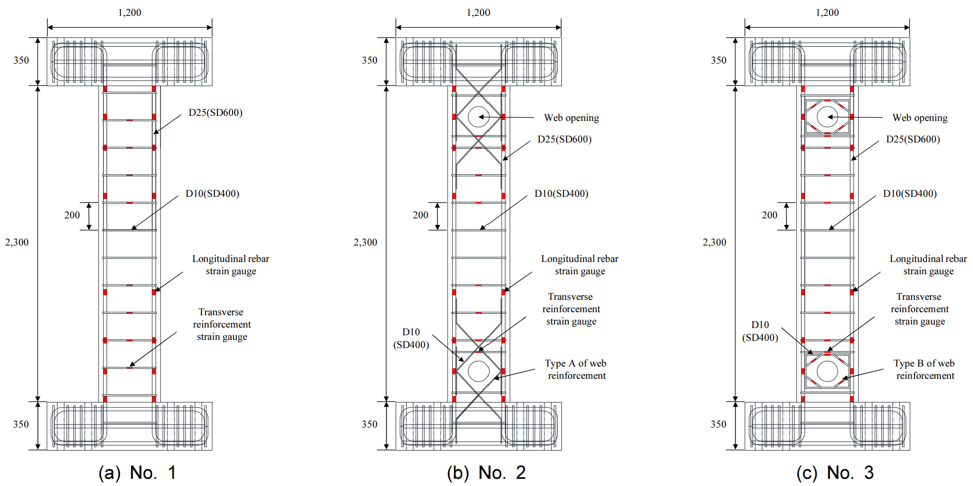 보강을 하지 않았다. 실험체의 전단파괴 선행을 위해 단면의 인장 및 압축측에 D25 철근을 4개씩 배근하였으며, 200 mm 간격으로 D10의 전단보강근을