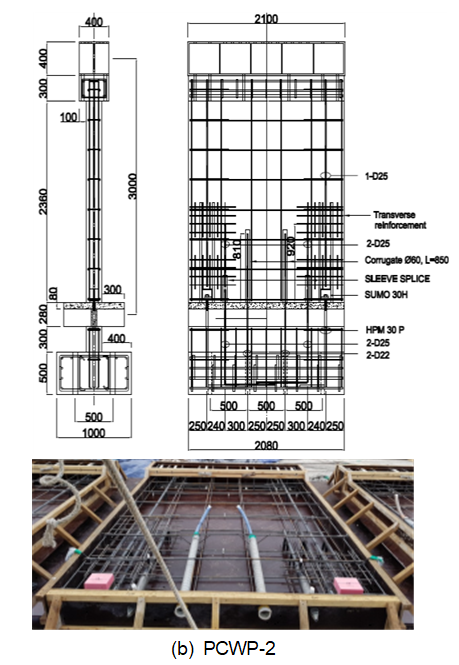Fig. 2는 실험체의 배근 상세를 나타낸다. 수평접합부에 요구되는 강도를 확보하기 위하여 PCWP-1 실험체는 2개의 박스형 연결재(SUMO 30H)로 벽체