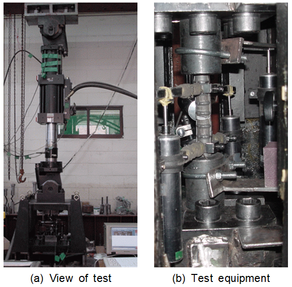 횡방향철근에 대한 반복인장 시험은 Fig. 3에 나타낸 시험장치를 제작하여 500 kN 용량의 유압가력기(actuator)를 사용하여 수행되었다. 철근 시험체를 실험장치에 고정하기 위하여 철근
