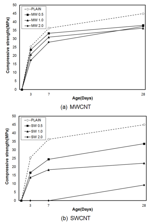 또한, CNTs 종류에 따라서는 SWCNT가 MWCNT보다 강도발현이 낮은 것으로 나타나고 있으며, 특히 SWCNT가 2.0 % 혼입된 실험체는 재령