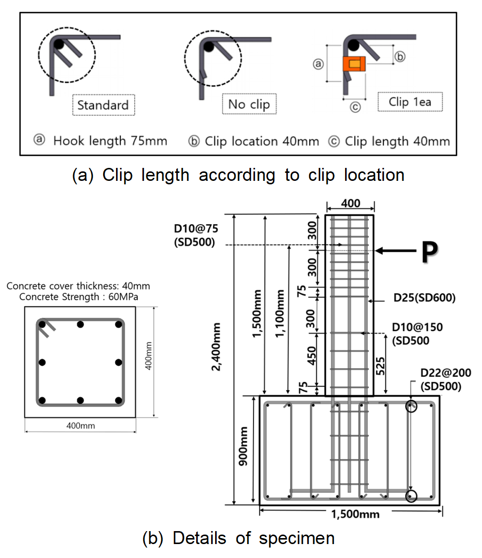 이미 띠철근의 한쪽 90° 갈고리에 제안된 강재 클립형 연결장치로 결속하는 상세에 대한 인발실험을 통하여 제안된 연결장치에 대한 정착성능을 검증하였으며(Park and Yun2020a), 피복 콘크리트 두께가 고려된 실험체를 이용하여 실제 RC 기둥과 같은 환경에서도 인발실험을 통하여 정착성능을 검증하였다(Kim et al. 2021).