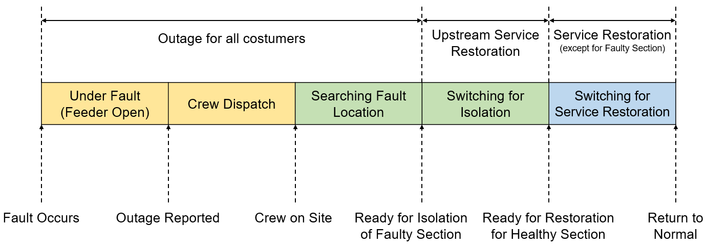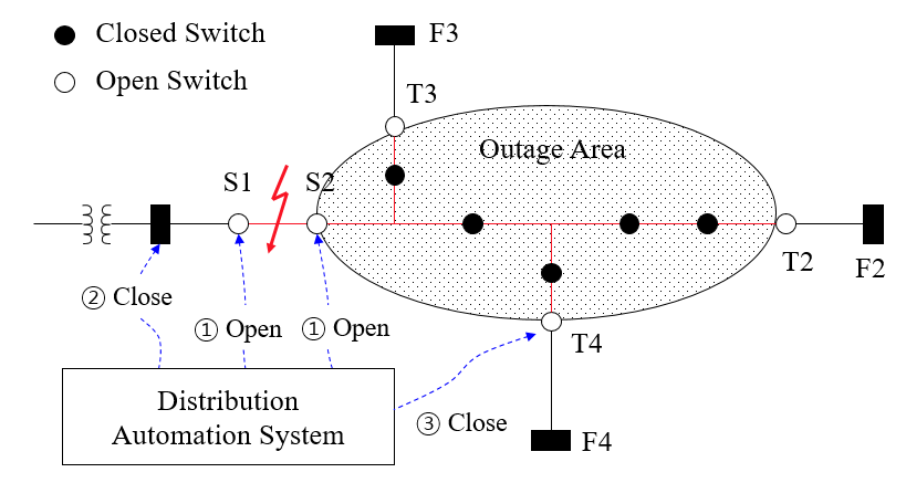 운영자는 적절한 복구 방안 수립 및 상시 개방 스위치, 자동화 스위치 조작을 통해 정전 부하들을 인근 피더들로 절체한다[14].