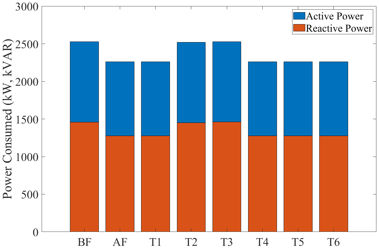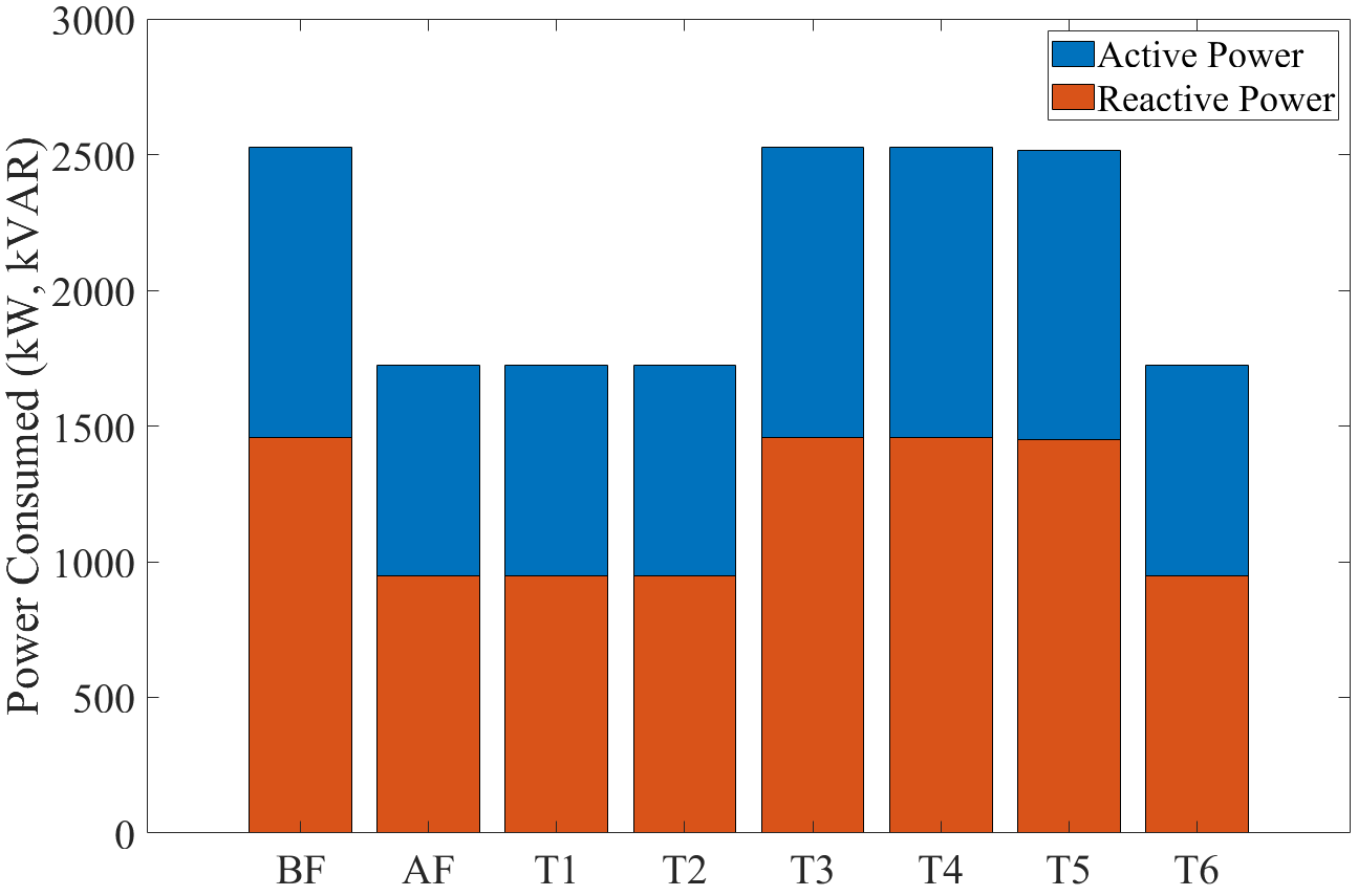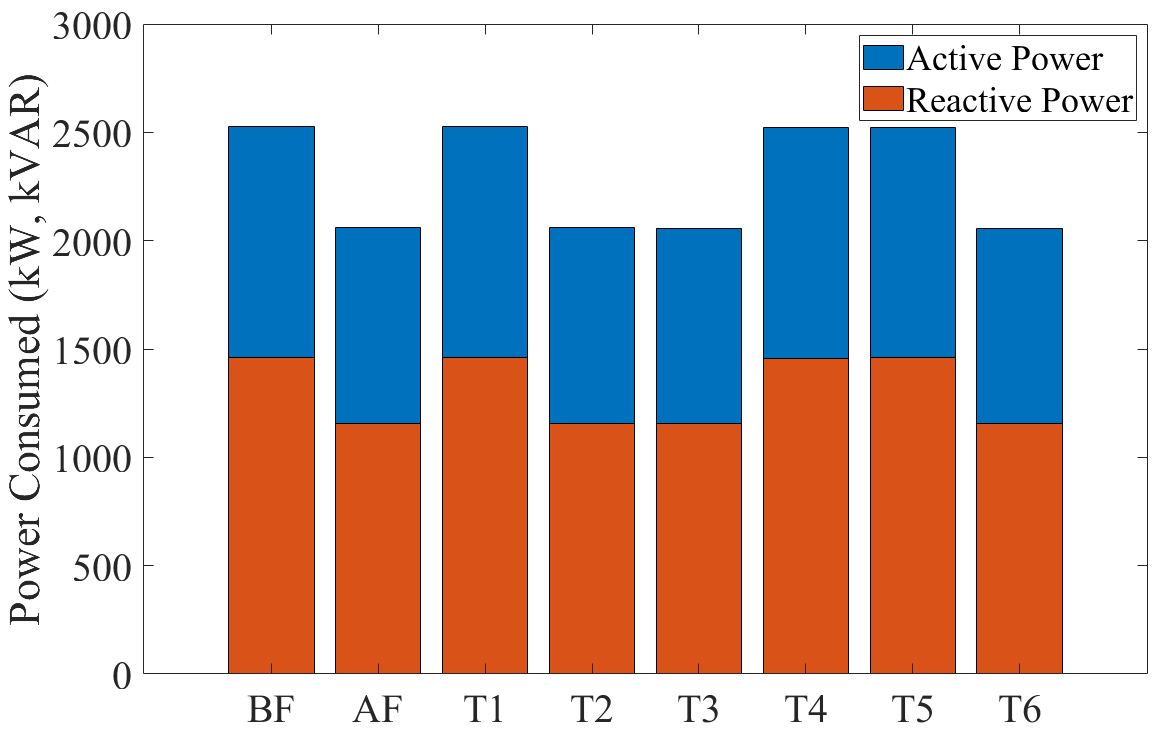 Fig. 9는 Case 1에 대한 토폴로지 별 유효 및 무효전력 소비량을 나타낸다. 고장 전(BF) 예제계통에는 2526kW의 유효전력이 공급되고 있으며, 713-704
