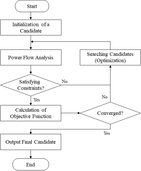 전류 등의 상태변수를 이용하여 제약조건을 판단한다. 제약조건 미충족 시에는 최적화 기법에 기초한 새로운 후보 생성을 통해 새로운 후보에 대한 조류계산