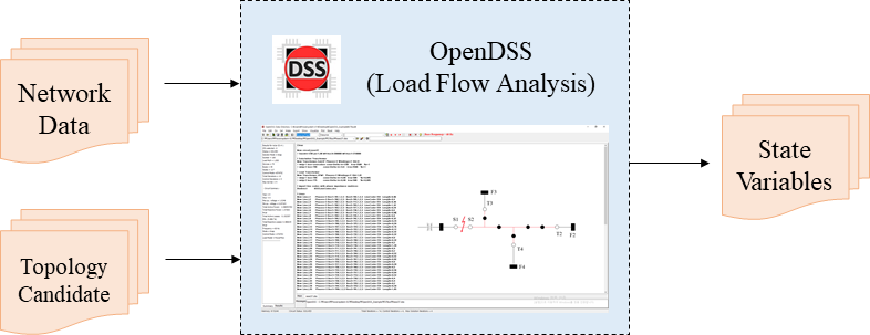 본 논문에서 제안된 연동 시뮬레이션 환경에서 OpenDSS는 Fig. 4와 같은 I/O 구조를 가지며, 계통 모델링 및 조류해석을 위한 데이터와 외부 시뮬레이션 도구에서 취득한 토폴로지 후보를 입력으로 받아 해당 토폴로지