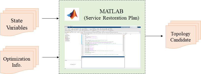 계산 및 최적화 기법 기반의 새로운 토폴로지 후보를 생성하여 조류해석을 담당하는 외부 시뮬레이션 도구로 전달한다. MATLAB은 배전자동화시스템에서