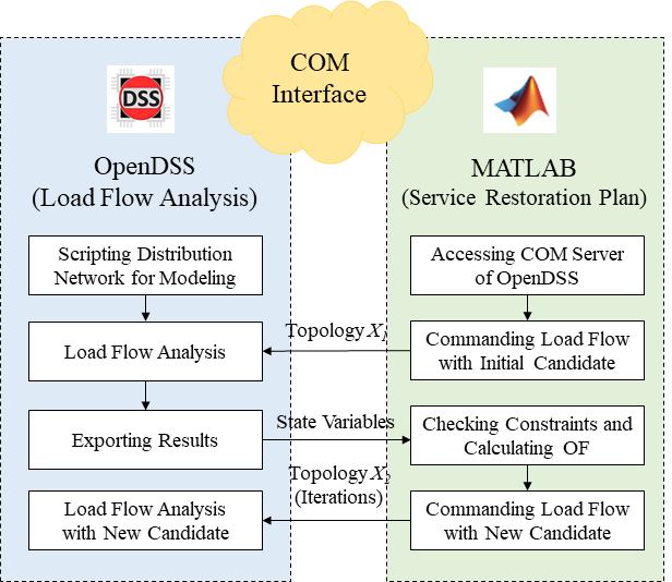 본 논문에서 제안하는 연동 시뮬레이션 환경에서 OpenDSS와 MATLAB은 각각 조류해석 및 정전복구 계획 수립 기능을 담당한다. 두 개의 서로