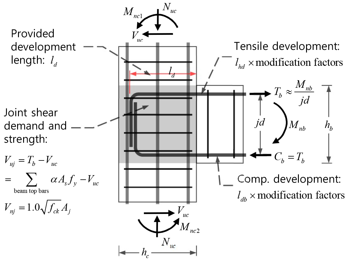 여기서, $A_{s}$ 및 $A_{s}'$=각각 보 인장철근 및 압축철근의 단면적, $b_{b}$=보 단면 폭, $A_{h}$=조인트에 배치된 후프철근의