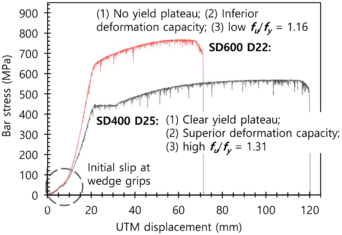5개 중 3개)에서 철근 인장파단이 관찰되었다. 그 원인을 파악하기 위하여 실험체에 사용되었던 SD 400 D25 철근과 SD600 D22 철근에