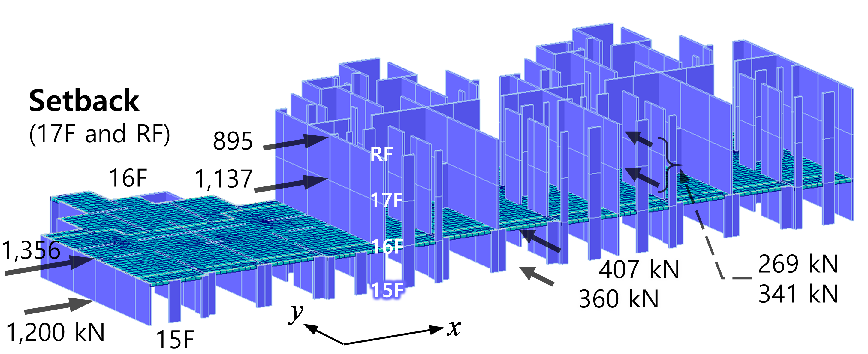 큰 횡강성을 갖는 엘리베이터 및 계단실 코어구조가 대부분 증축부에 설치된다. 이러한 경우에도 기존 골조의 지진하중(즉, 관성력)이 슬래브 접합부를