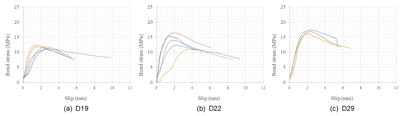 Fig. 11 Flexural bond stress vs. slip curves for ordinary steel rebars