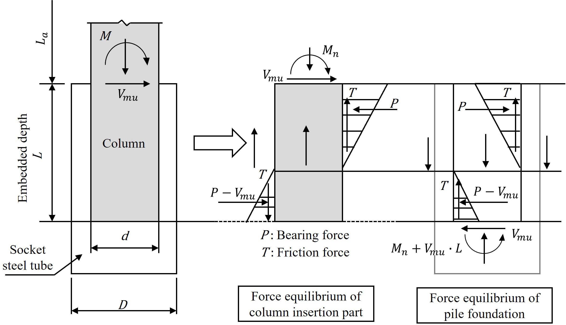 소켓식 연결부의 휨강도($M_{n}$)는 지압력($P$), 전단력($V_{mu}$), 마찰력($T$)과 연립하여 식 (3)과 같이 나타난다. 여기서, $N_{d}'$은 기둥의 설계 축방향 압축력이다.