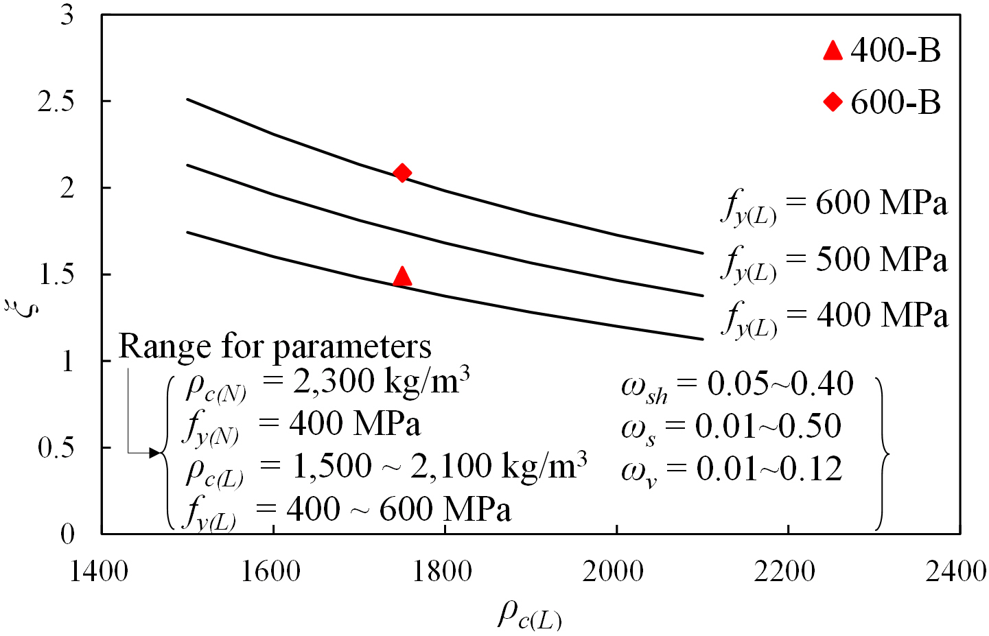 Fig. 11에는 $\rho_{c(L)}$와 $\xi$의 관계를 나타내었다. $\xi$에 대한 예측값은 $\rho_{c(N)}$ 및 $f_{y(N)}$를 일반적인